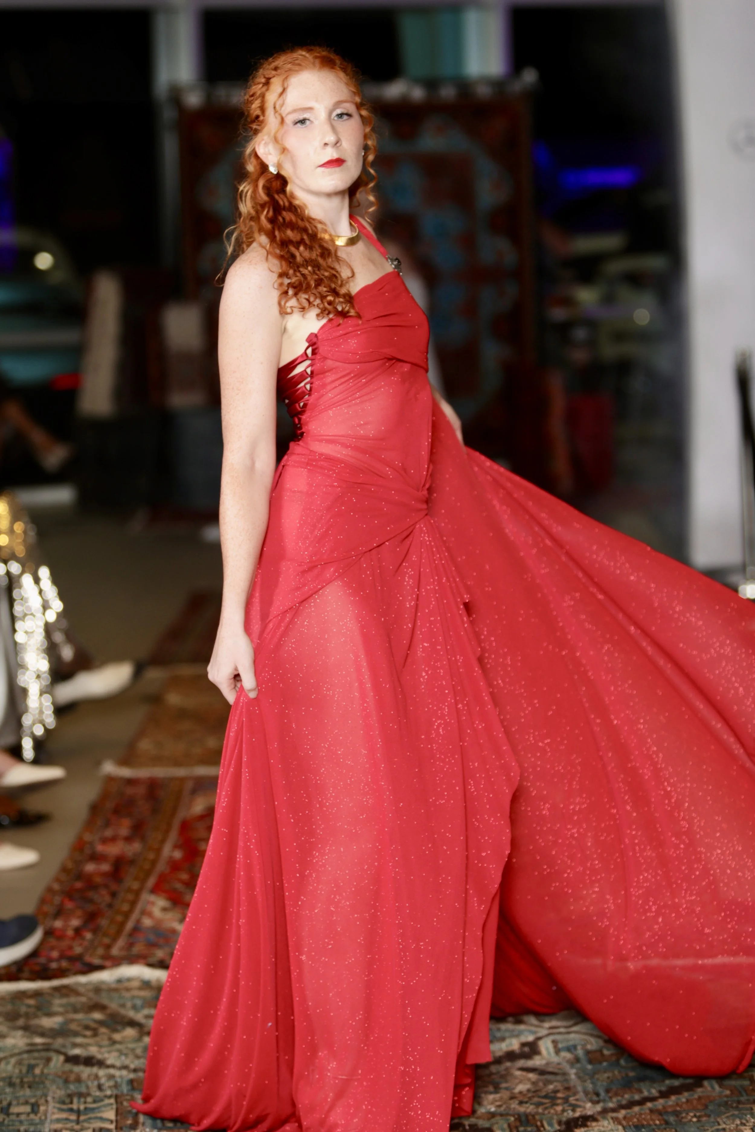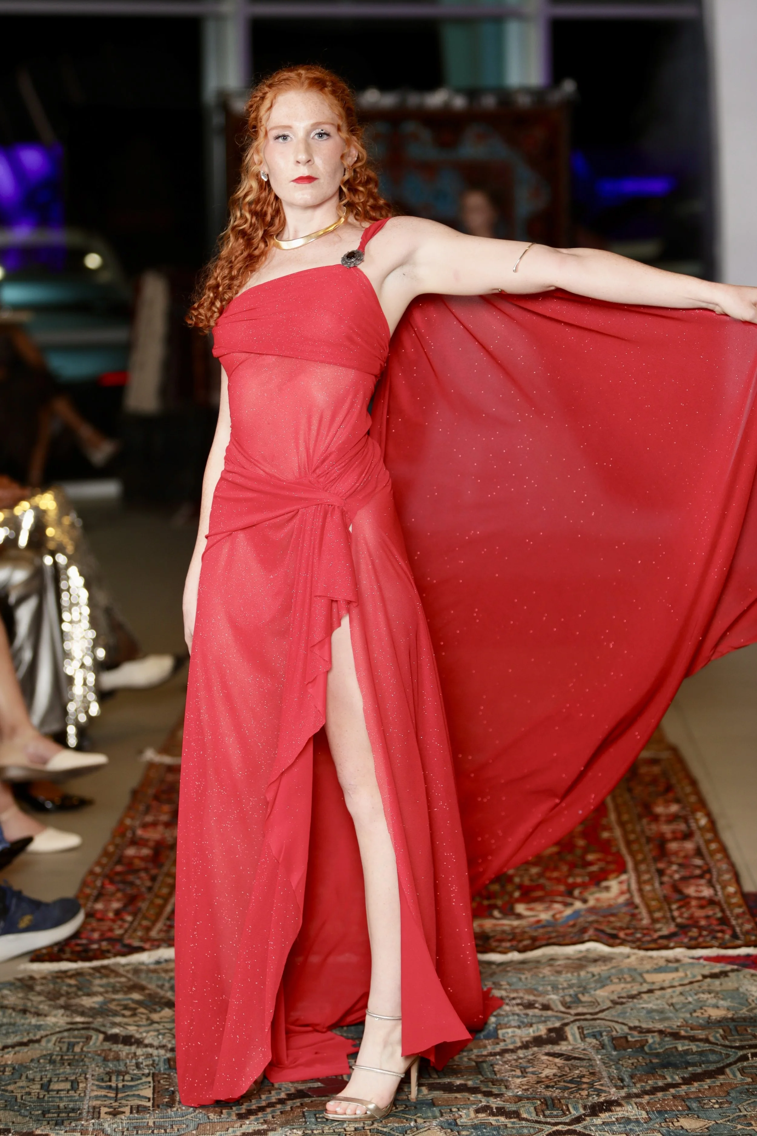 A gathered waist detail creates sculptural movement through the skirt, while an extended floating panel forms a cape-like effect, adding theatrical presence and runway drama. Subtle sparkle woven throughout the fabric catches the light, enhancing the gown’s fiery depth and fluidity.